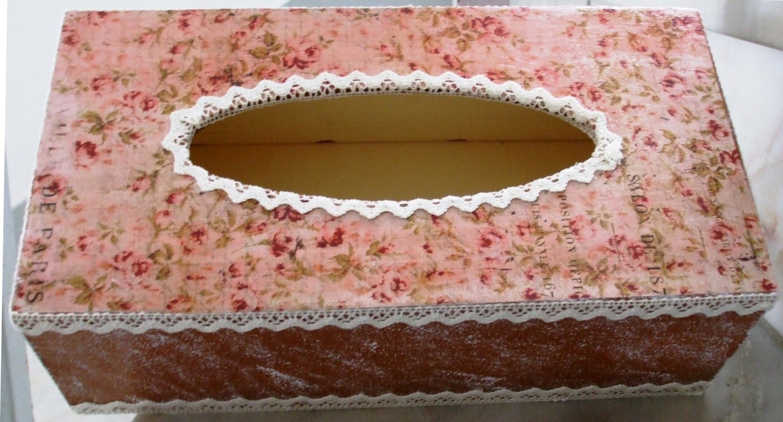 | A Eugénia, já veterana nestas lides, decorou esta caixa de lenços, com papel découpage. |